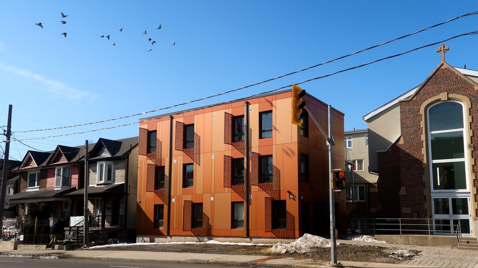 St. Clare’s Multifaith Housing Society – a non-profit dedicated to providing affordable housing and supportive services, recognized the urgent need to provide new affordable housing in Toronto. With a goal to “make their land work harder”, they developed 1120 Ossington, a three-storey, 25-unit supportive housing project built on land they already owned and was adjacent to one of their existing properties (a converted church which currently provides 20 units of supportive housing).