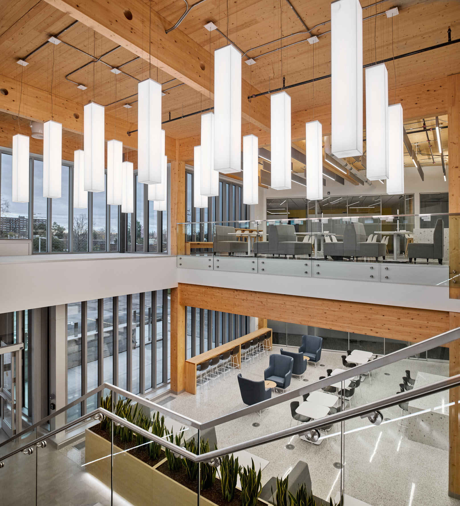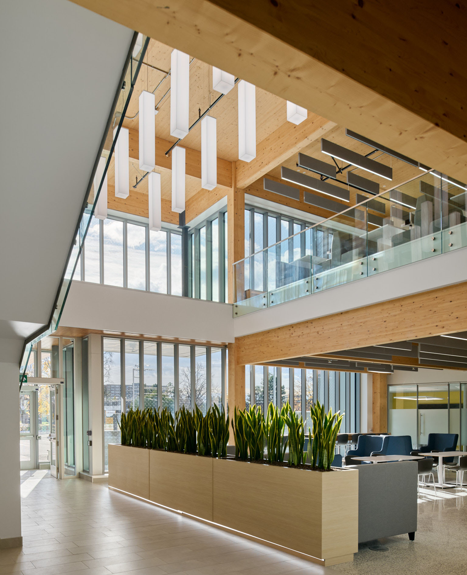 The use of mass timber for the superstructure was the primary factor in the building earning Zero Carbon Building Design certification, complemented by a range of efficient technologies, including: