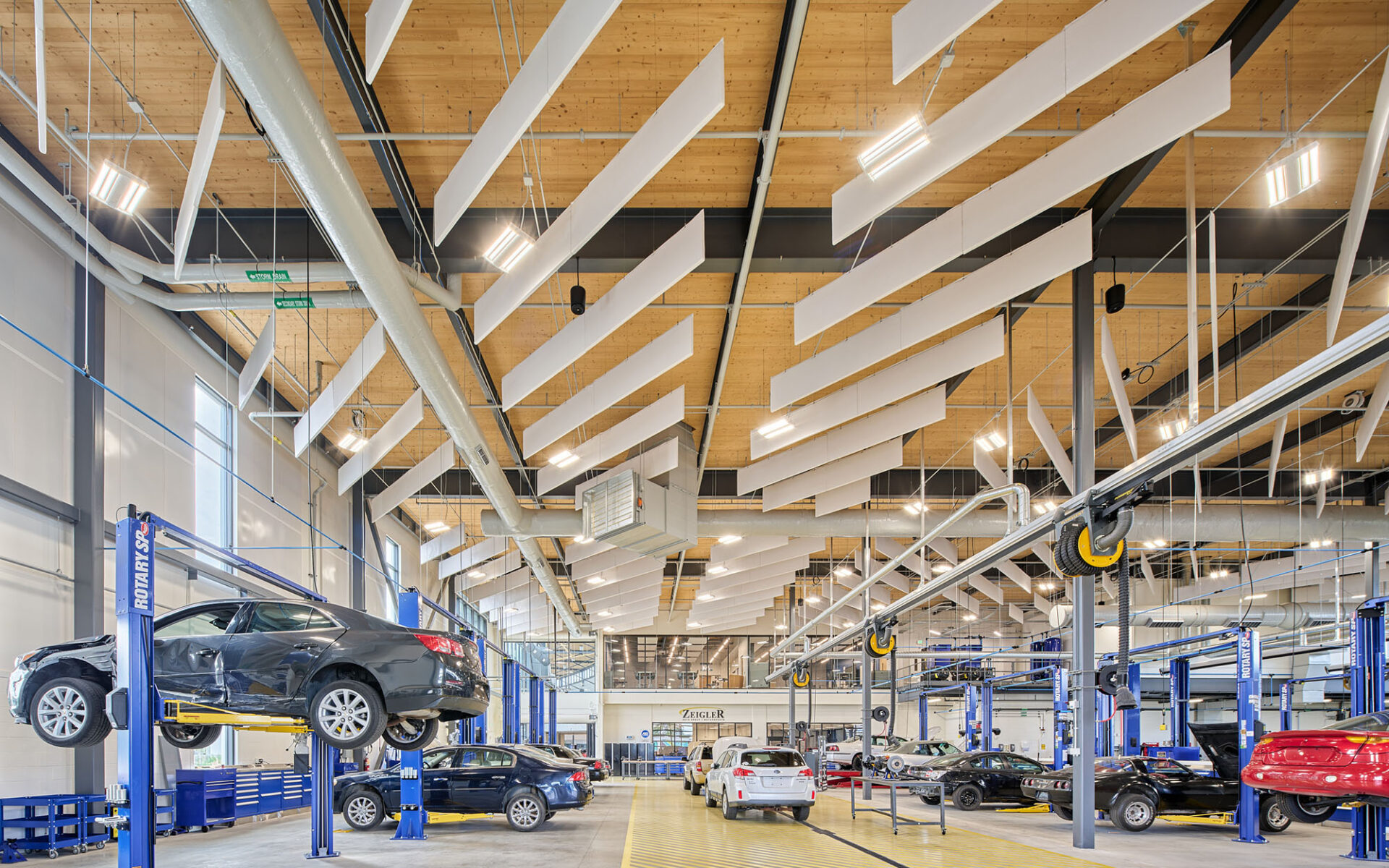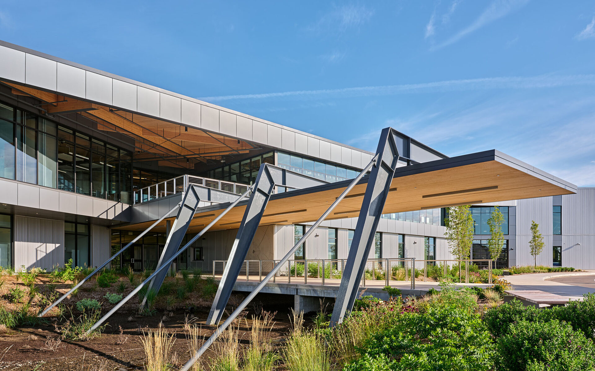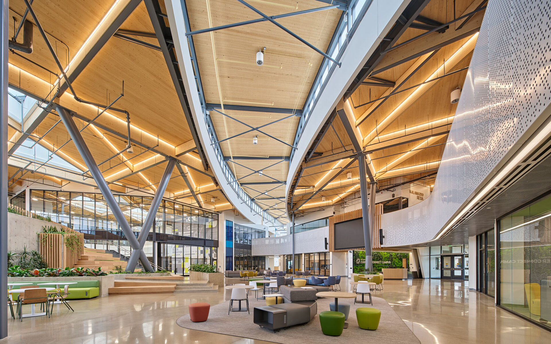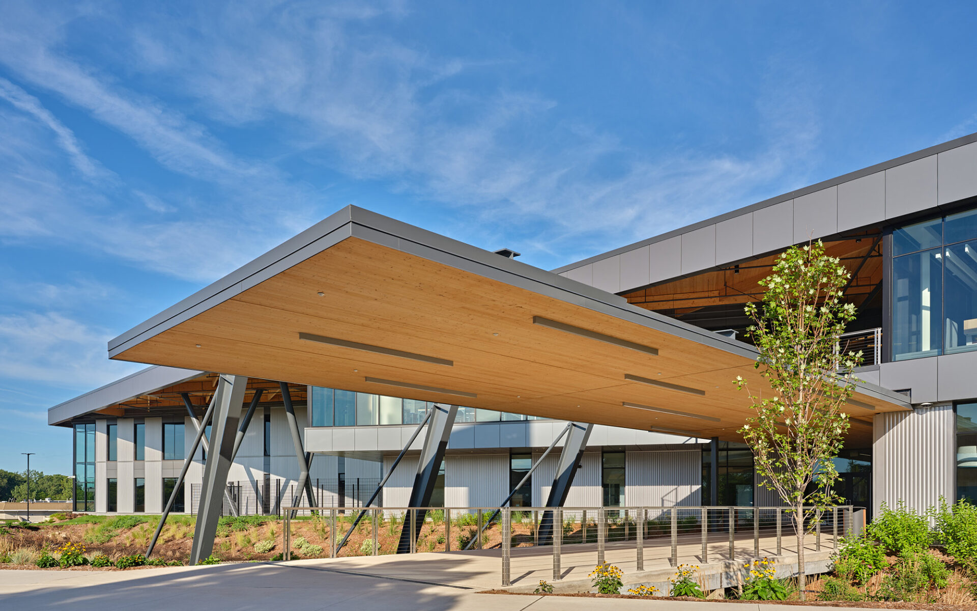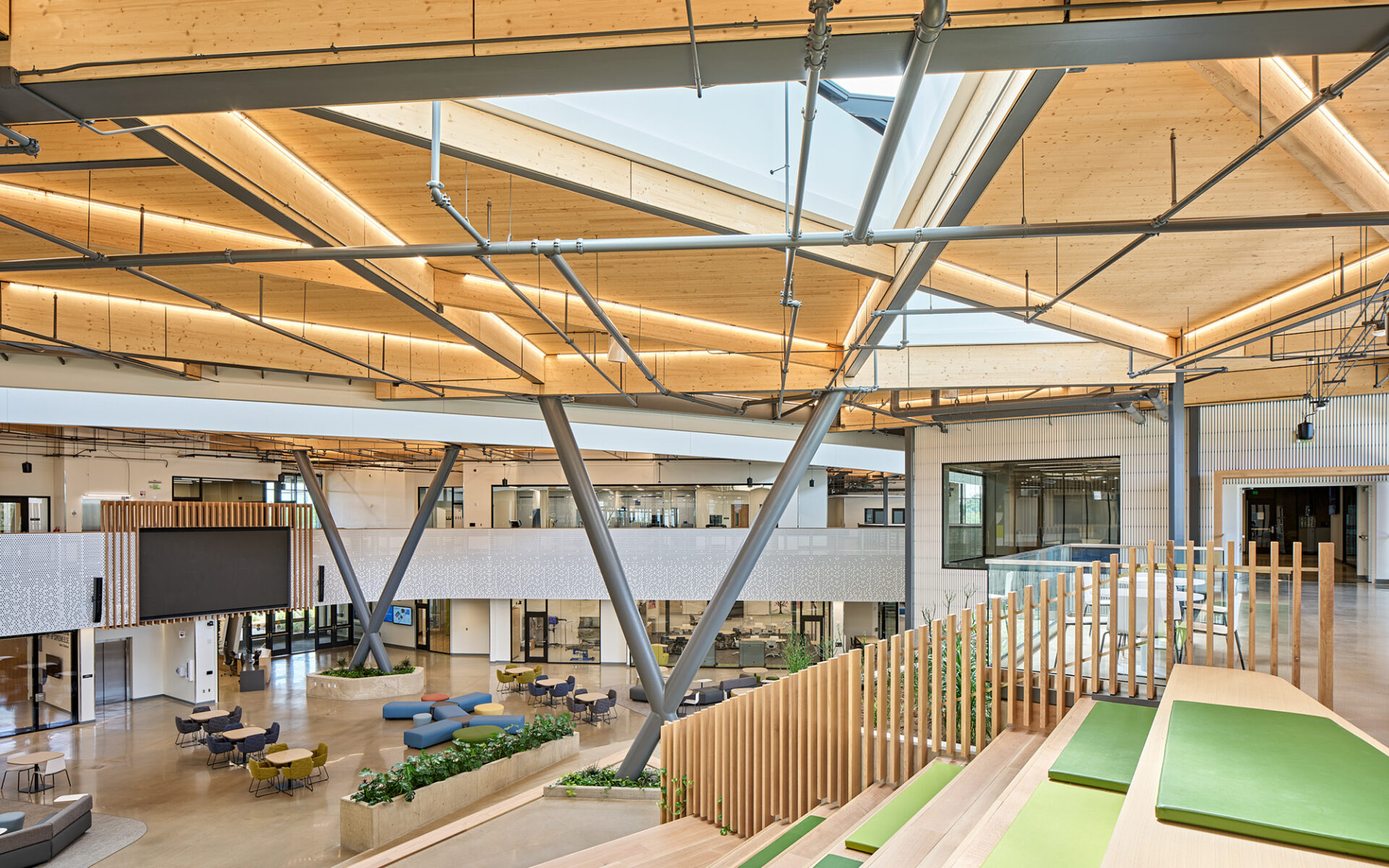 A central design mandate was to create an environment that reflected Michigan’s landscape. The team sought abundant daylight, strong indoor-outdoor connections, and the use of sustainable materials – criteria that pointed to mass timber.