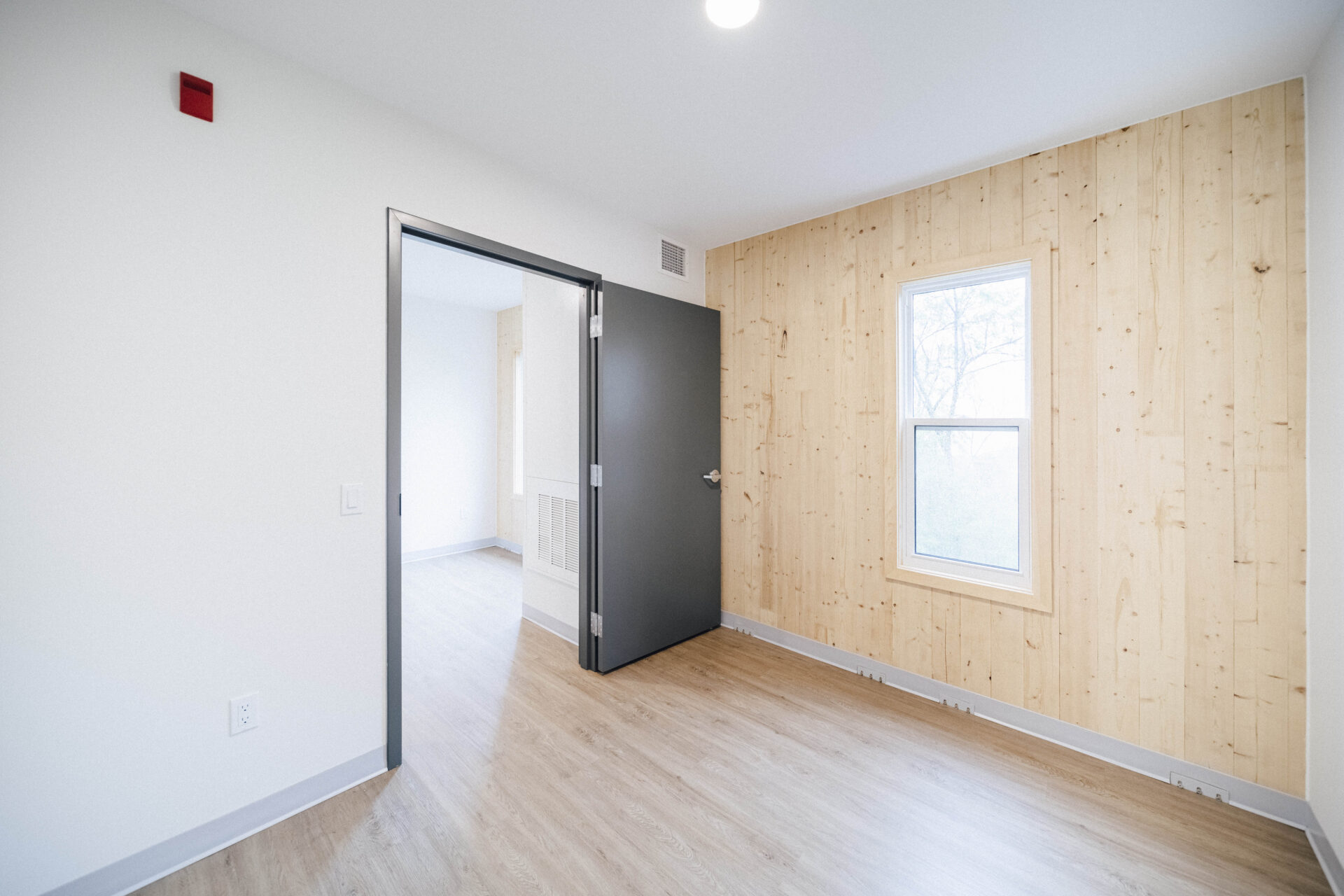 Blue Door operates the building and provides individualized support to the residents to help them live independently and to move them into permanent housing. The structure is also highly sustainable, thermally efficient, and features exposed wood throughout the build to promote health and wellness.